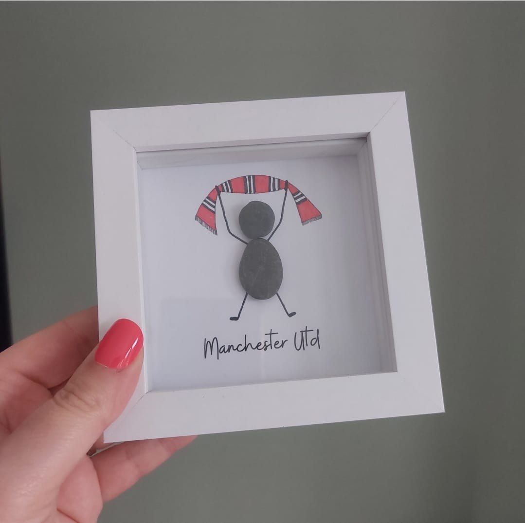 For the fan who bleeds red. This handcrafted design features a minimalist pebble figure proudly holding a striped Manchester United scarf aloft—capturing the passion and pride of match day in a simple, striking way. Made with natural stones and bold colours, each frame is a one-of-a-kind tribute to football loyalty. A perfect gift for birthdays, Father’s Day, or any Red Devil who loves their club.