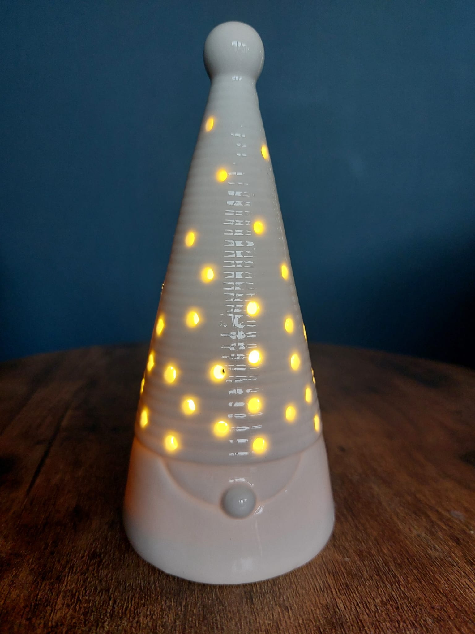 Battery operated LED Santa's head. With cut out holes in his hat, the lights will shine through creating a warm glow.