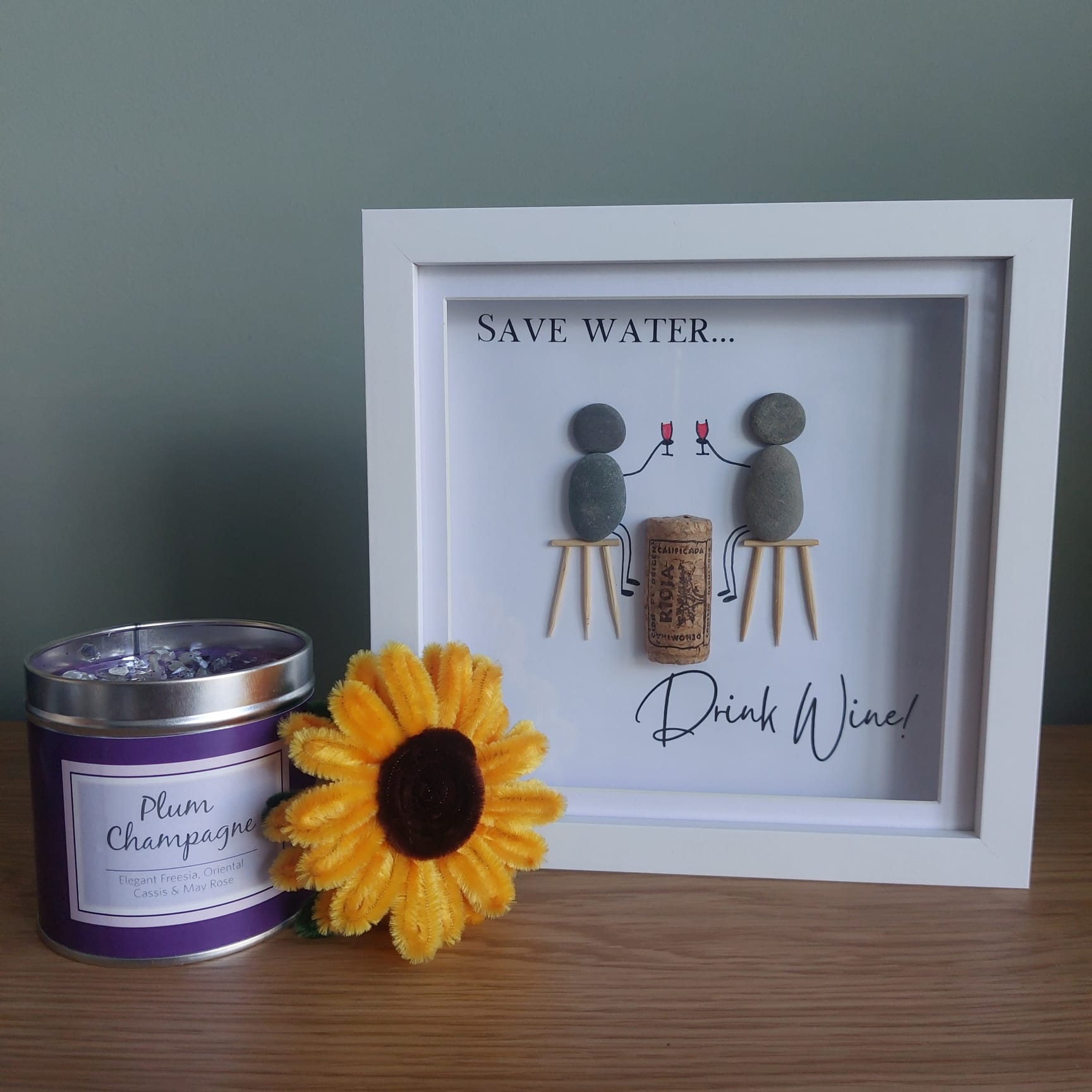 Raise a glass to creativity with this handcrafted pebble art frame that blends rustic charm with cheeky humour. Featuring two pebble figures enjoying a glass of wine, this piece is a celebration of good company, great taste, and a little bit of mischief.